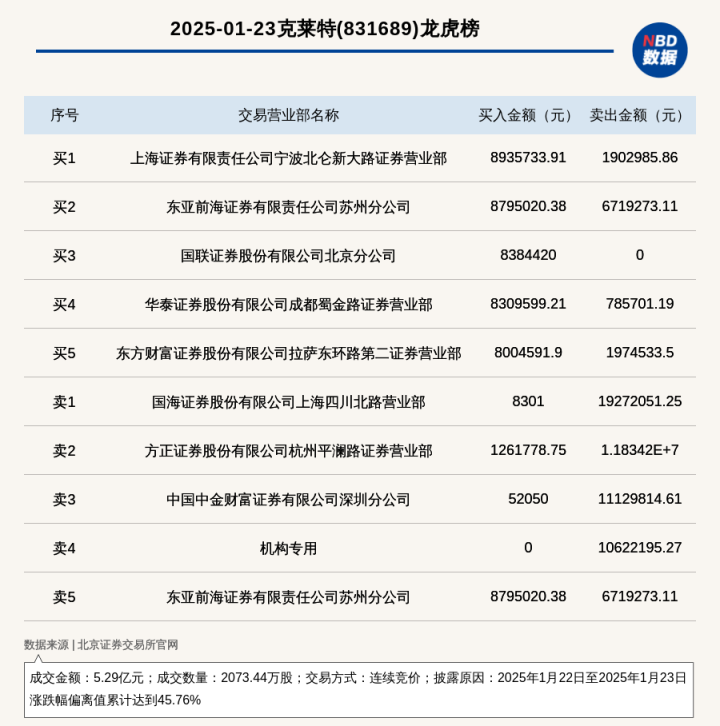 每经讯,2025年1月23日,北交所上市公司克莱特(831689,收盘价:27.66元)登上龙虎榜,交易方式是连续竞价,披露原因是2025年1月22日至2025年1月23日涨跌幅偏离值累计达到45.76%,成交数量2073.44万股,成交金额5.29亿元。买一席位为上海证券有限责任公司宁波北仑新大路证券营业部,买入893.57万元;卖一席位为国海证券股份有限公司上海四川北路营业部,卖出1927.21万元。